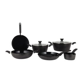 Royalford Elite 7-Piece Forged Aluminum Cookware Set- RF12622 Durable Nonstick Granite Coating with 5-Layer Construction, CD Bottom and Glass Lid/ Includes Casserole, Saucepan, Fry Pan, Nylon Kitchen Tools, PFOA-Free/ Black