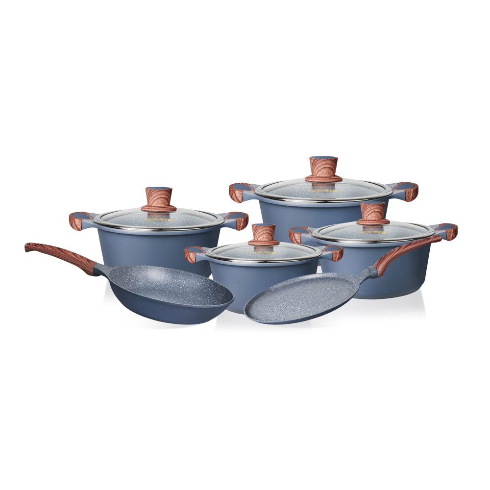 Royalford 10-piece Kitchencraft Die-Cast Aluminum Cookware Set- RF12951/ Granite Coated, with 4 mm Induction Base, Wood-Finish Handles and Tempered Glass Lid/ Induction Compatible, Includes Casseroles and Fry Pan/ Blue