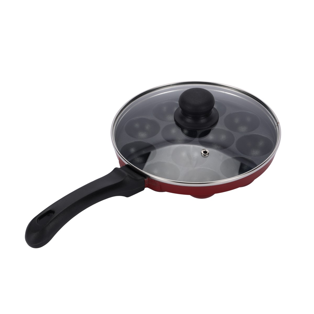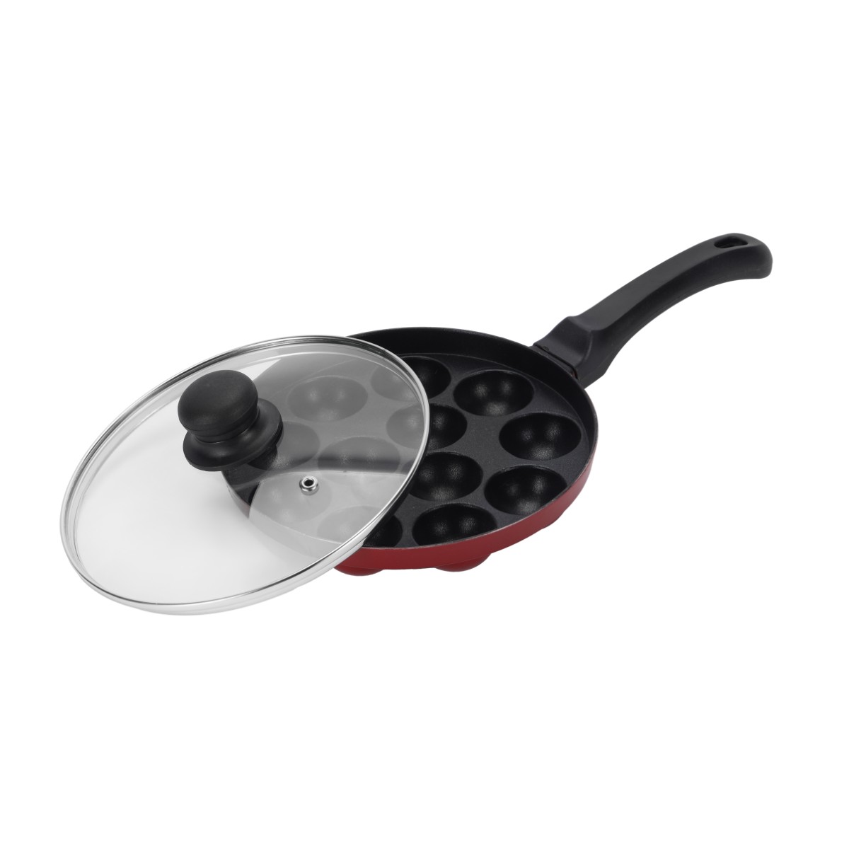 Royalford 12 Pits Nonstick Paniyaram Pan – RF13013/ 21 cm, Aluminum Body with Long Handle and Glass Lid/ Multipurpose, Dishwasher Safe, Perfect for Appe, Takoyaki, Stuffed Bites, Mini Omelettes, etc./ Red