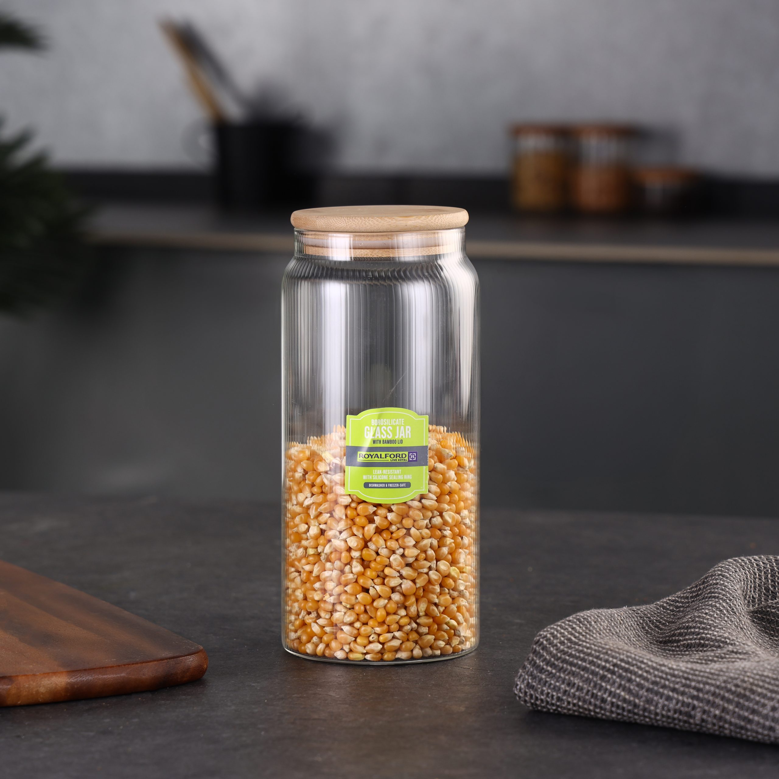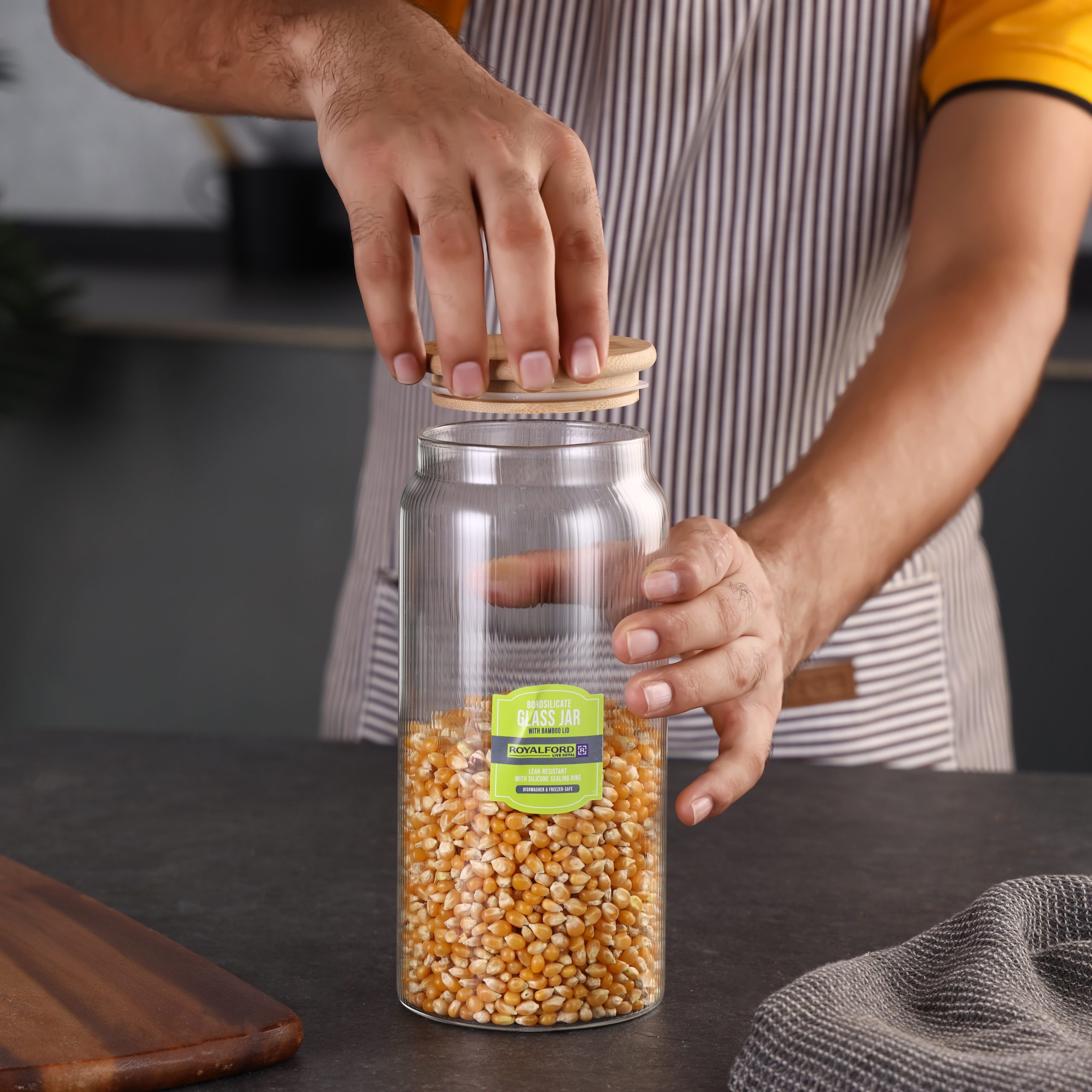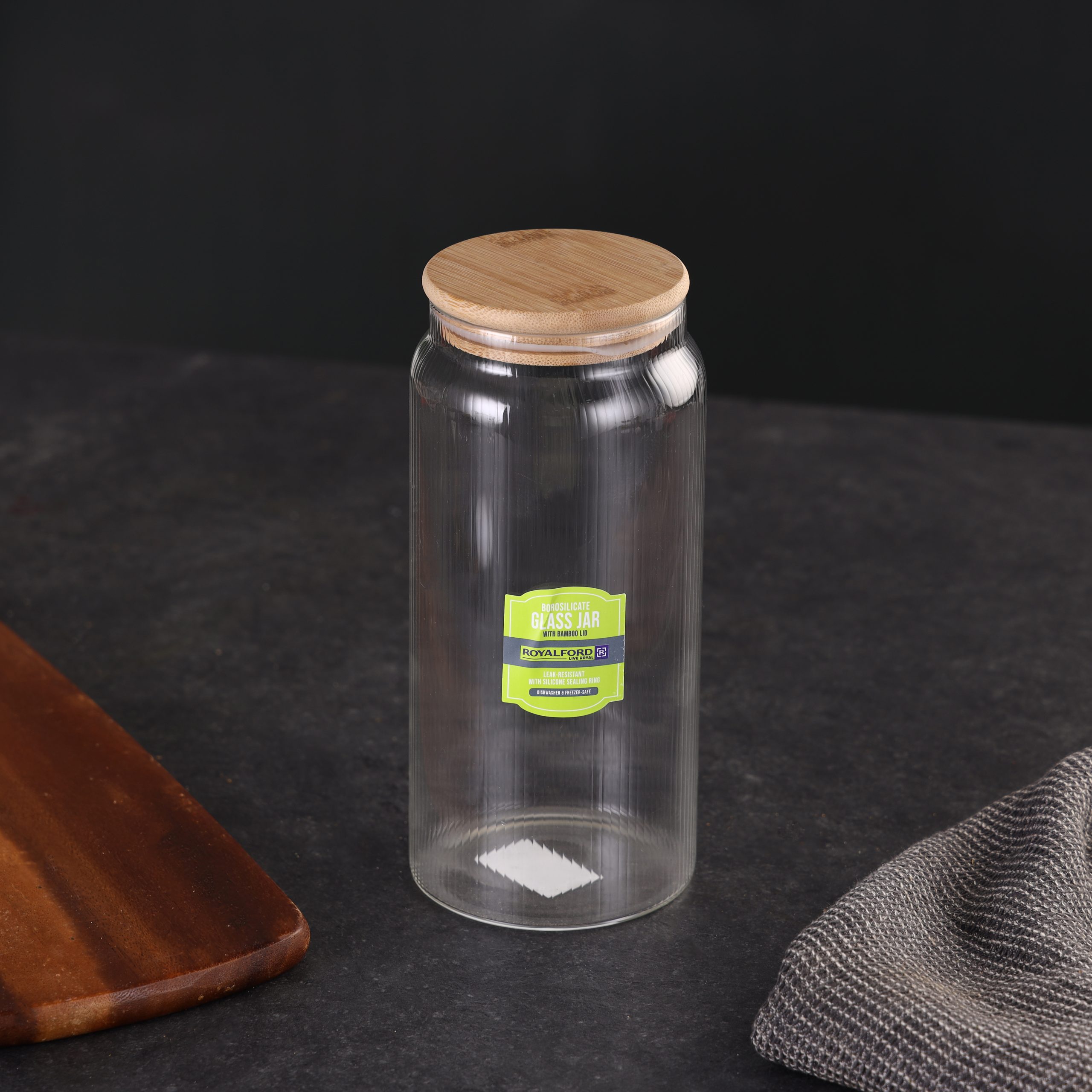 Store smartly and sustainably with this Royalford borosilicate glass jar, a sleek and practical solution for your modern kitchen. With a generous 1300 ml capacity and compact size (10(d)x21.5 cm), it’s the perfect storage solution for dry ingredients, pulses, grains, pasta, snacks, coffee, or nuts. With a high-quality borosilicate glass body and a bamboo lid, the round airtight jar can keep food fresh and safe for a long time. The jar is made from food-grade, non-toxic, BPA-free material and does not harm your body in any way. This transparent glass jar with an airtight bamboo lid has a variety of uses. It can be used to store coffee beans, dried fruits, cotton pads, or craft supplies and is designed to blend seamlessly into any modern or minimalist space. The transparent body allows you to monitor the contents inside without opening it. The airtight lid with a thick silicone liner ensures that the contents remain fresh and tasty. It is also easy to clean, easy to maintain, and can be washed in a dishwasher. The compact size and shape make it easy to store. It is safe to handle as it has round and smooth edges. The product stands out in terms of looks and efficiency. The glass jar weighs 0.380 kg.