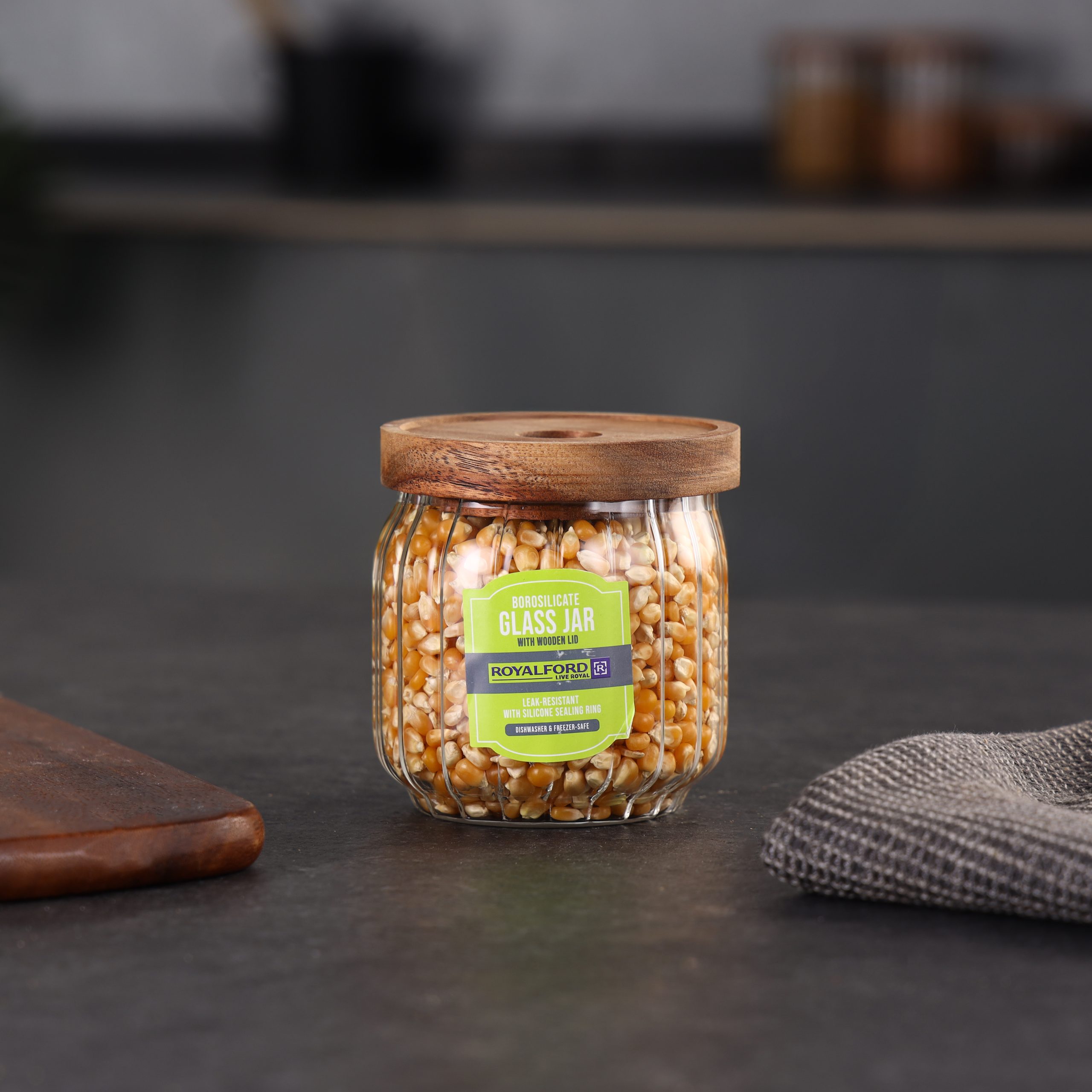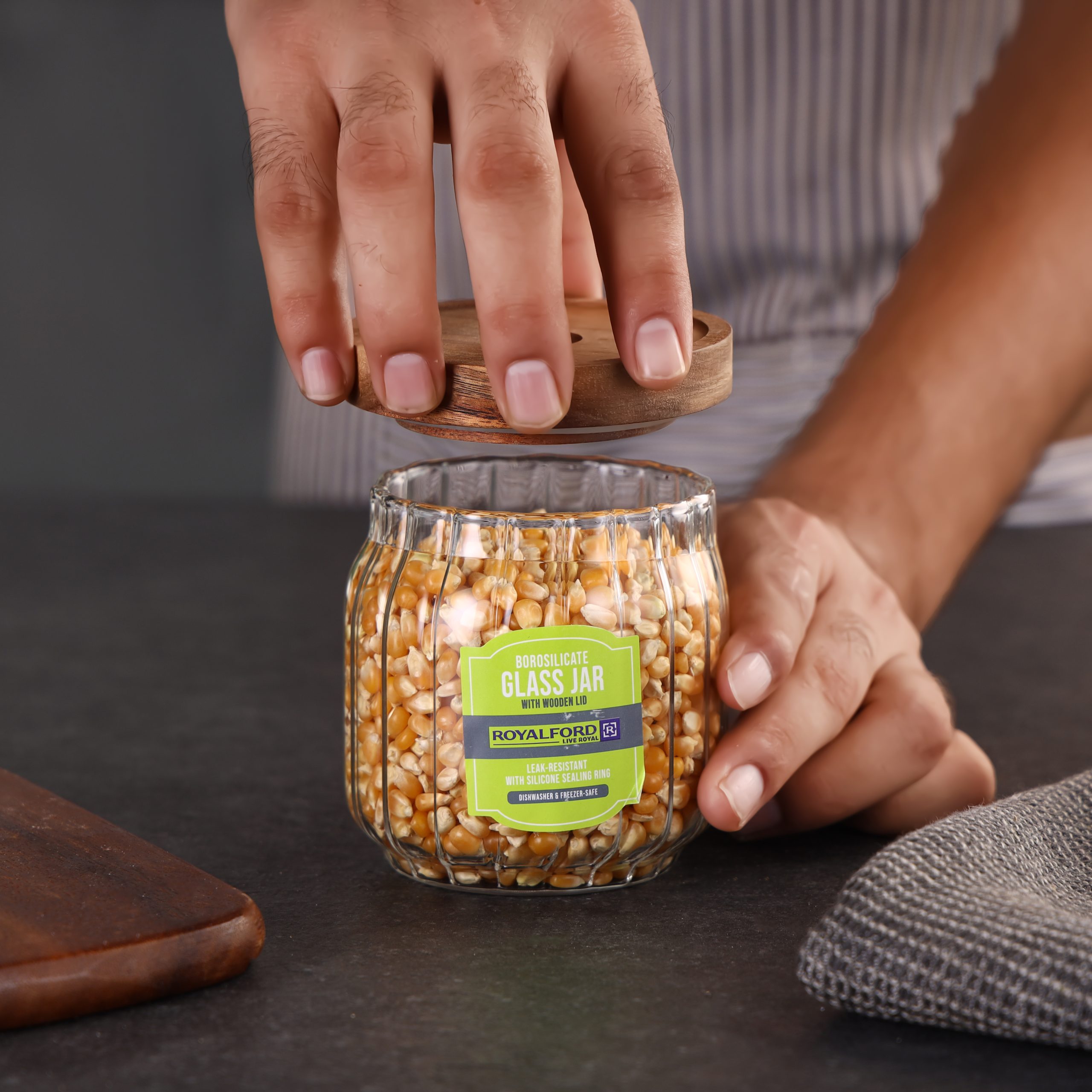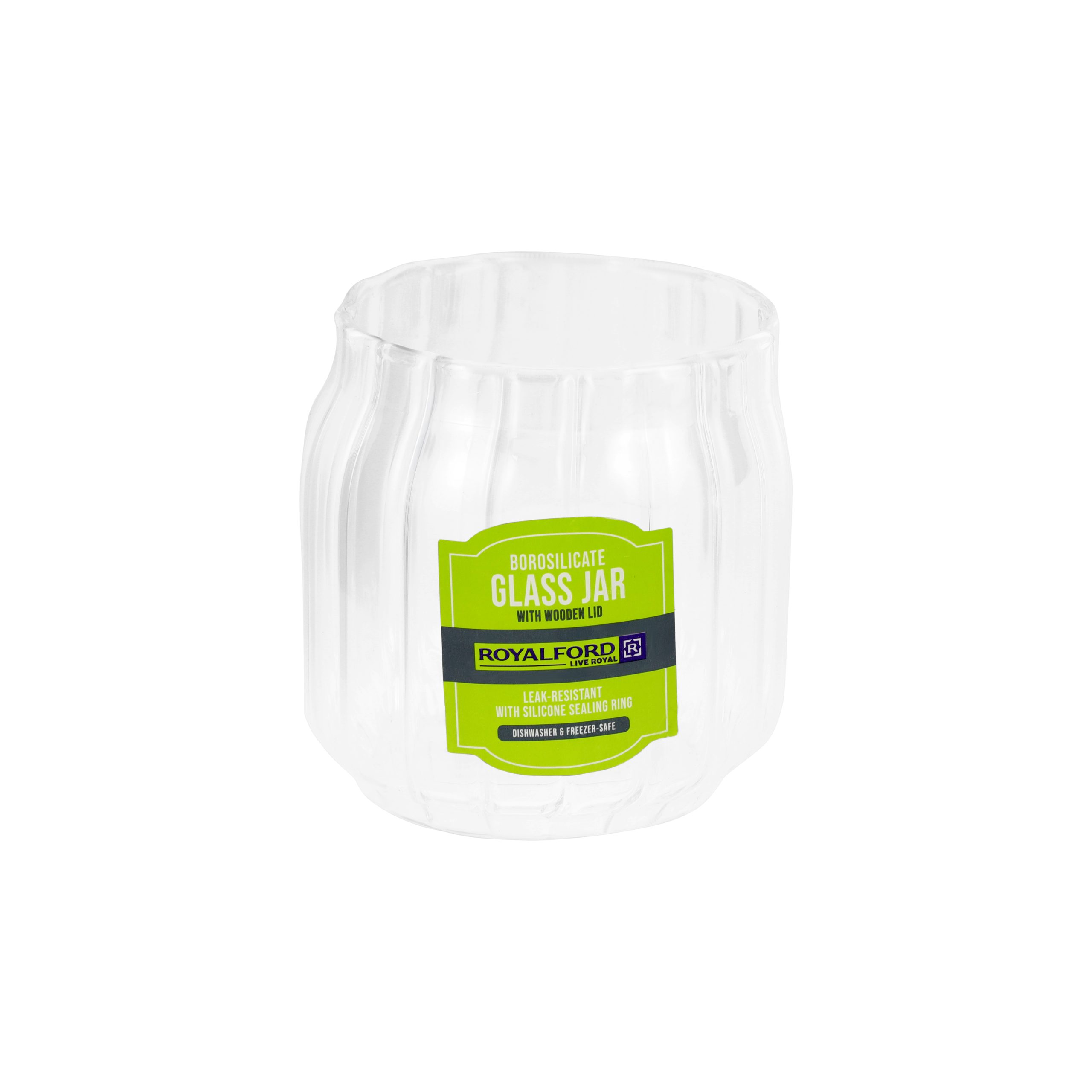 Your kitchen’s new favorite jar. Organize your kitchen or workspace in style with this sleek and durable Royalford borosilicate glass jar. With a generous 350 ml capacity and compact size (9(d)x9.5 cm), it’s the perfect storage solution for dry ingredients, snacks, spices, or even bathroom essentials. With a high-quality borosilicate glass body and a wooden lid, the round airtight jar can keep food fresh and safe for a long time. The jar is made from food-grade, non-toxic, BPA-free material and does not harm your body in any way. This transparent glass jar with an airtight wooden lid has a variety of uses. It can be used to store coffee beans, dried fruits, cotton pads, or craft supplies and is designed to blend seamlessly into any modern or minimalist space. The transparent body allows you to monitor the contents inside without opening it. The airtight lid with a thick silicone liner ensures that the contents remain fresh and tasty. It is also easy to clean, easy to maintain, and can be washed in a dishwasher. The compact size and shape make it easy to store. It is safe to handle as it has round and smooth edges. The product stands out in terms of looks and efficiency. The glass jar weighs 0.180 kg.