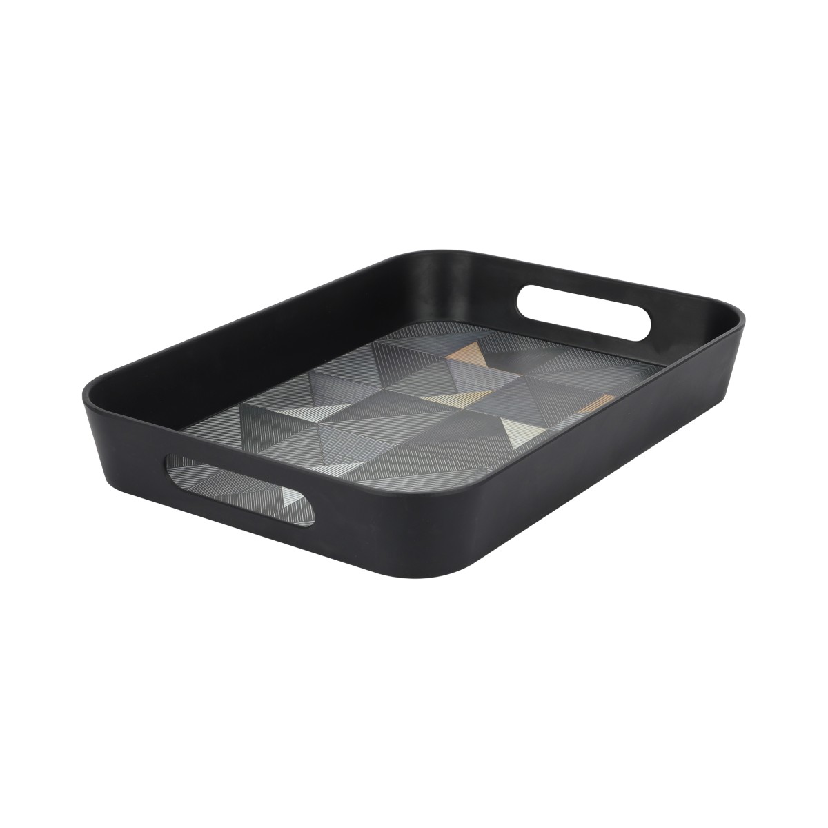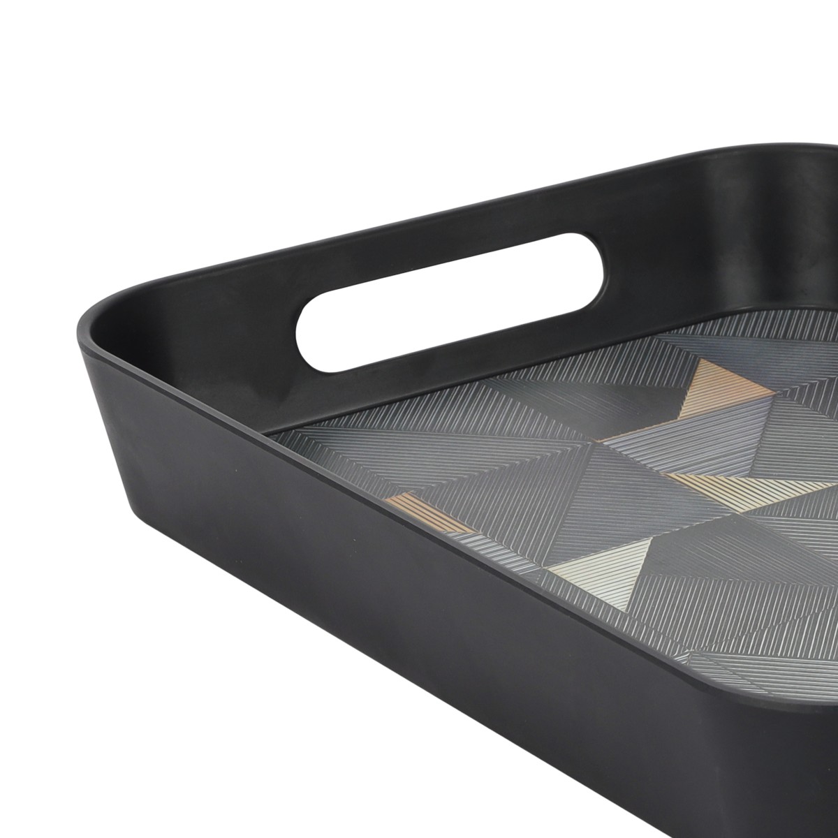 Where function meets modern print. Royalford offers you a melamine serving tray that is sure to entertain your guests in style. The tray is designed for everyday use and is made of BPA-free, non-toxic, 100% food-grade, durable, safe, and high-quality melamine material. The tray has multiple purposes and can be used for serving snacks and drinks, as a kitchen tray, as home dcor, as an organizer, etc. It features an abstract color combination with geometrics. The tray can be used at home, in restaurants, or on any occasion. The trays do not break and are a safe replacement for ceramic, plastic, and glass trays. The tray can be reused and washed with ease by hand and is dishwasher safe. The tray has a smooth, rounded edge, making it safe to carry around. With a generous size of 35.5×25.5 cm and a lightweight build of 0.640 kg, this tray offers ample space for serving beverages, snacks, or desserts while remaining easy to carry. Made with top-quality material, this tray is durable and has a longer shelf life. The premium-quality paint does not fade easily and enhances the lifespan of the product. Perfect for both casual and semi-formal settings, it combines durability, style, and functionality in one elegant piece.